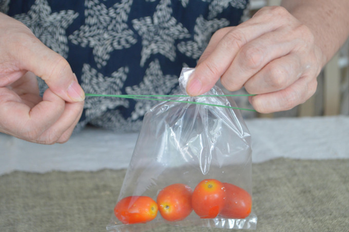 3.輪ゴムのハジを左手の小指にかけて、袋の首に輪ゴムを巻きつける。