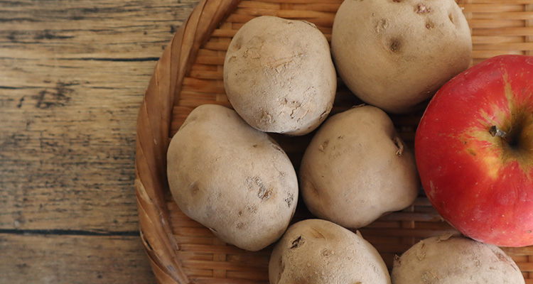 このような事態を未然に防ぐため、ご家庭でじゃがいもを保存するときは蛍光灯や日の光が当たる場所は避けるようにしましょう。保存は常温で大丈夫ですが、新聞紙などに包んで風通しのよい冷暗所に置くことをおすすめします。また、りんごと一緒に保存すると、りんごが発するエチレンガスが発芽を抑制してくれるとか。一度試してみてはいかがでしょうか?